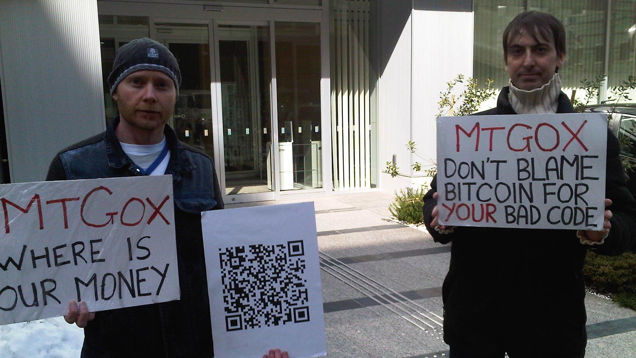 마운트곡스 파산 피해자들의 항의 시위 : "마운트곡스, 우리돈 내놔!"(좌) / "마운트곡스, 니들이 잘못해 놓고 비트코인은 왜 비난하냐?" (우)