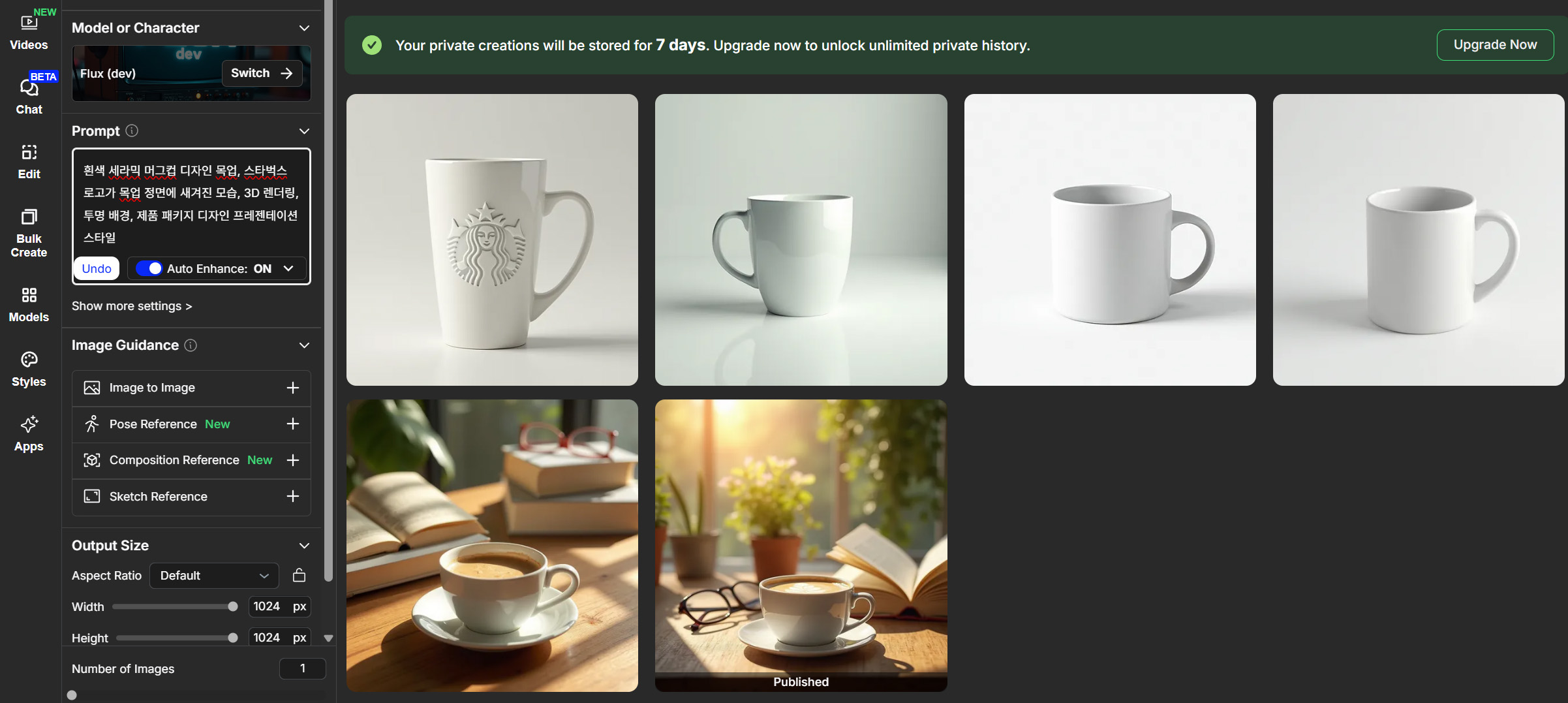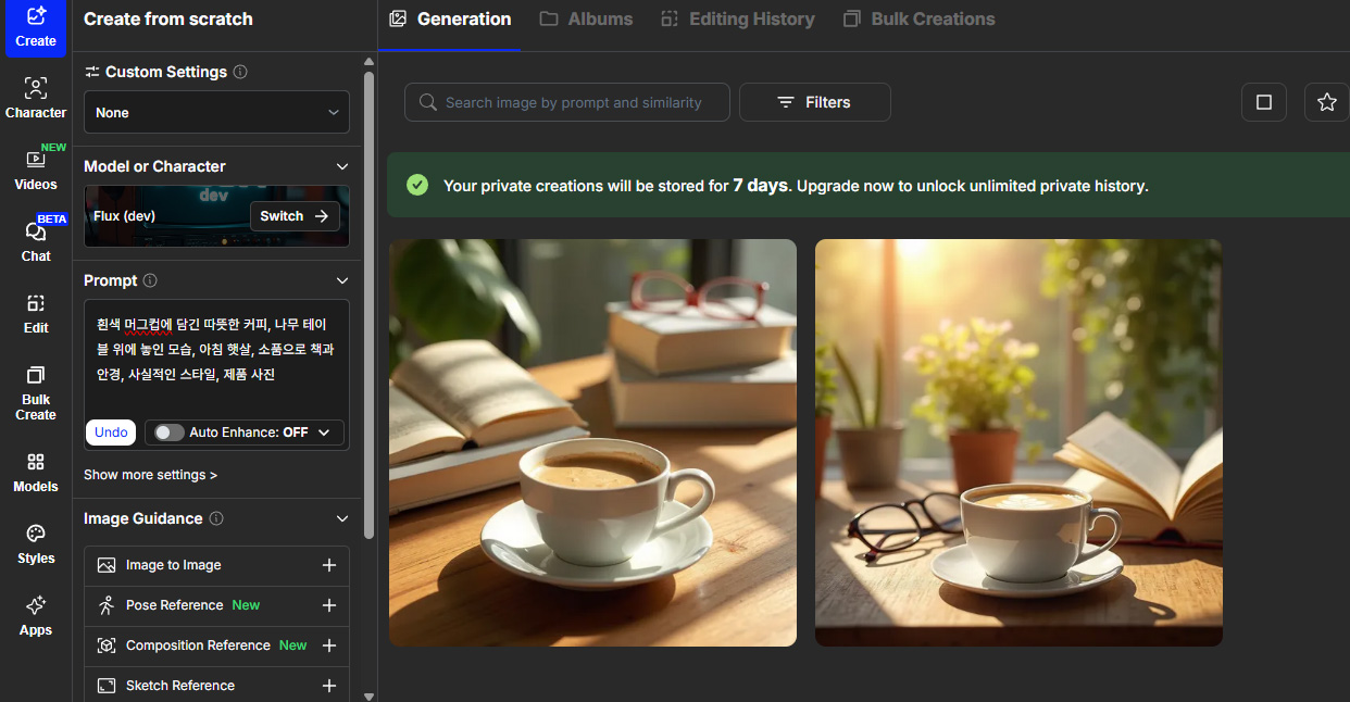 한국어 지원과 직관적인 인터페이스가 특징인 마이에딧은 레퍼런스 이미지 활용에 뛰어난 성능을 보입니다. 기본적으로 매일 20장의 이미지를 무료로 생성할 수 있어 초보자가 부담 없이 시작하기 좋습니다.