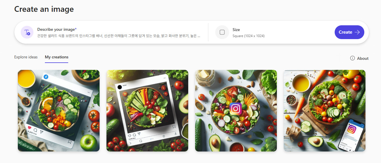 프롬프트: "건강한 샐러드 식품 브랜드의 인스타그램 배너, 신선한 야채들이 그릇에 담겨 있는 모습, 밝고 화사한 분위기, 높은 대비, 정사각형 구도"